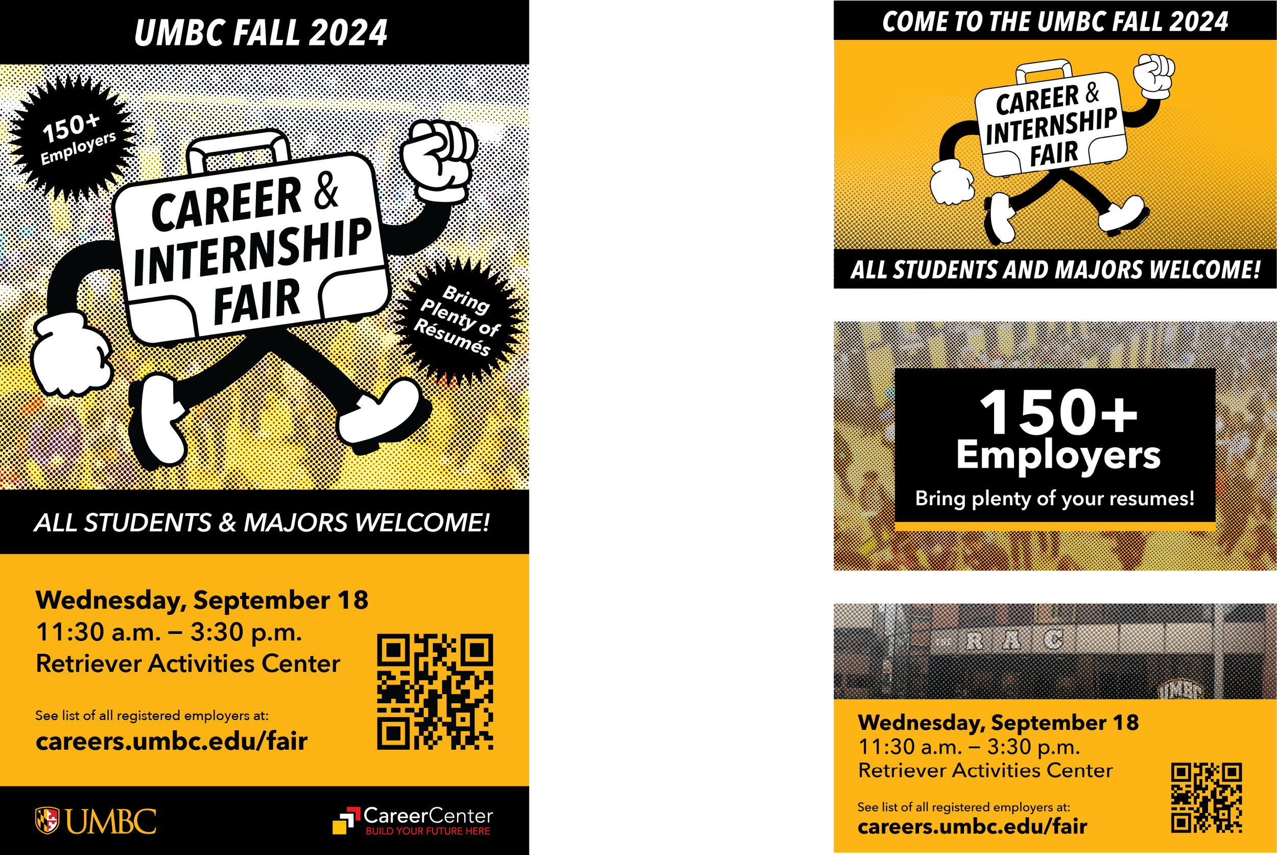 Every semester, the UMBC Career Center connects students with employers through its Career and Internship Fair. I collaborated with their team on the Fall 2024 campaign to create an animation broadcast on public screens across campus.