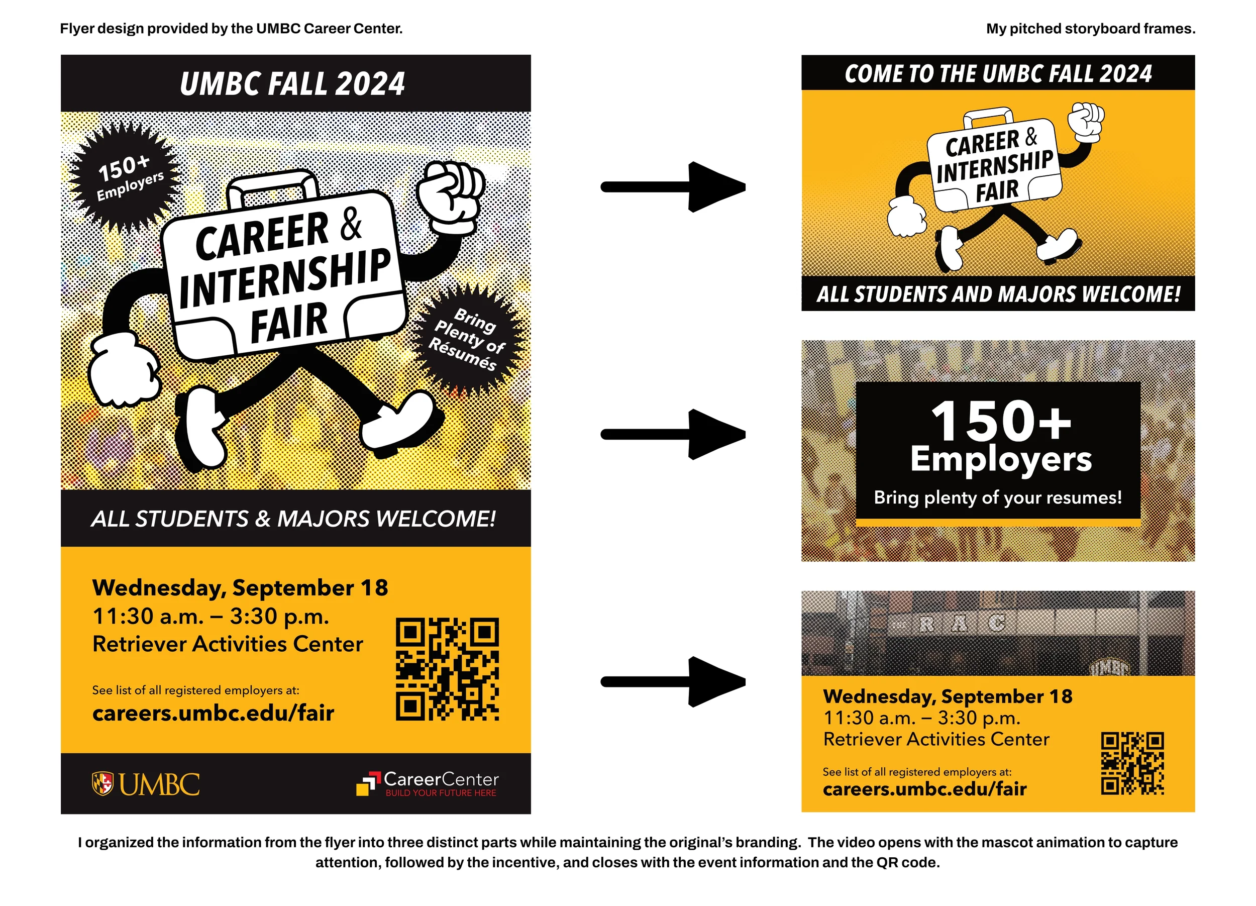 Every semester, the UMBC Career Center connects students with employers through its Career and Internship Fair. I collaborated with their team on the Fall 2024 campaign to create an animation broadcast on public screens across campus.